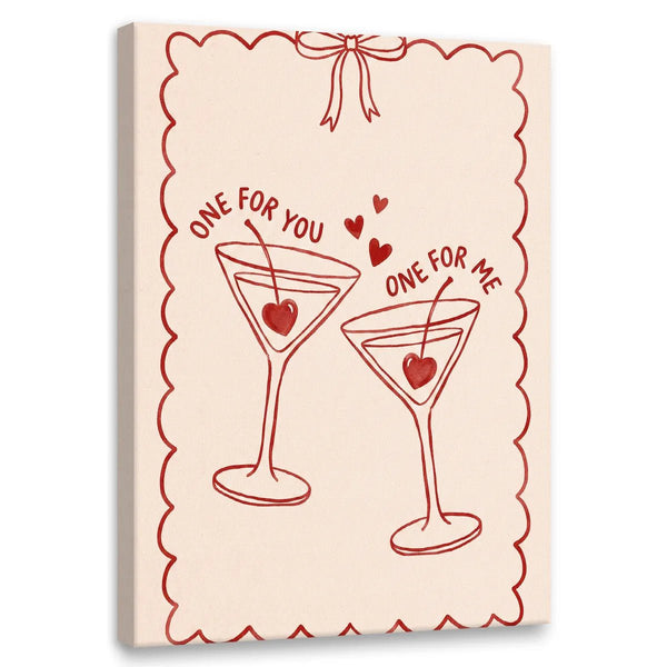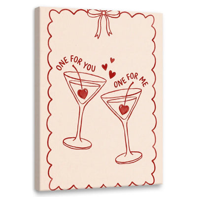 Symbols like the two glasses, floating hearts, and a shared bow suggest moments of togetherness. The phrase “ONE FOR YOU, ONE FOR ME” arches above each glass, reinforcing a sense of shared affection that quietly resonates in personal spaces.