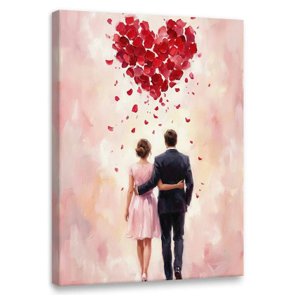 In a softly lit bedroom, this canvas wall art draws the eye with its romantic imagery—a couple walking arm-in-arm beneath a heart formed from red rose petals. The painterly style and pastel tones create a gentle focal point that warms the space visually and emotionally.