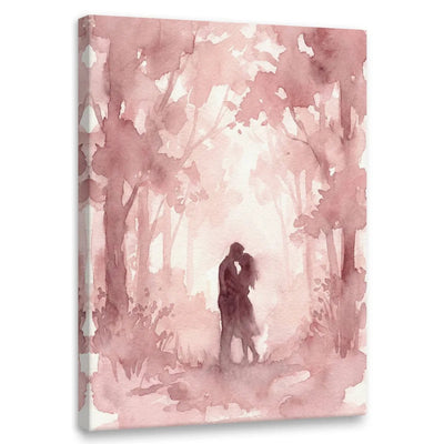 In a softly lit bedroom, this romantic canvas wall art brings a sense of quiet intimacy. A silhouetted couple embraces at the center of a rose-toned watercolor forest, diffused in light and framed by delicate trees.
