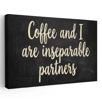 This canvas wall art features a bold handwritten-style quote that reads, “Coffee and I are inseparable partners,” centered on a black background. The quote acts as the primary visual hook, immediately drawing attention with its casual, conversational tone and coffee-themed message.