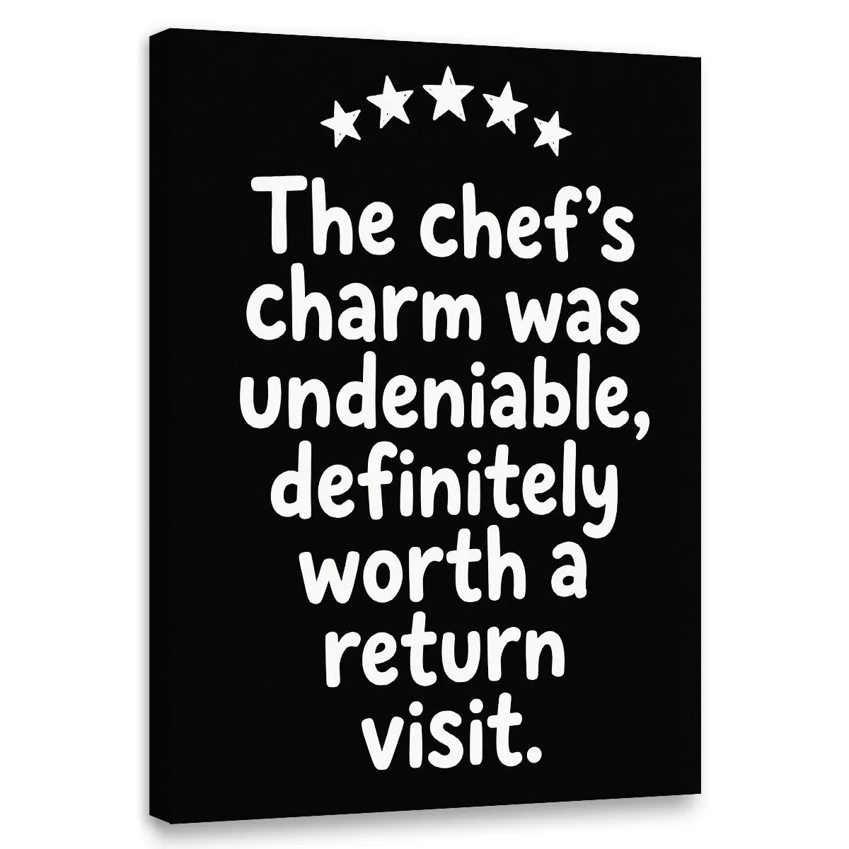 A curved row of five white stars crowns the bold quote, “The chef’s charm was undeniable, definitely worth a return visit,” creating a visually striking focal point. This playful text arrangement instantly evokes a familiar tone of lighthearted praise, clearly centered on culinary enjoyment.