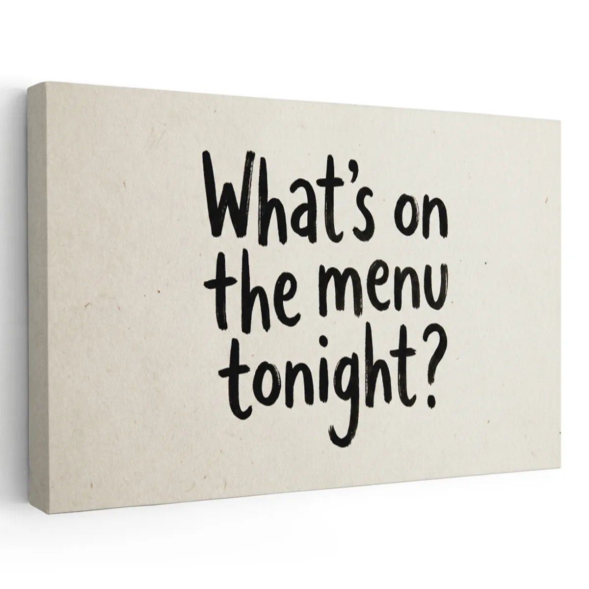 This kitchen quote canvas wall art features the handwritten phrase “What’s on the menu tonight?” in bold black text. The centered typography is the visual focal point, making it a playful yet clean accent for casual dining spaces.