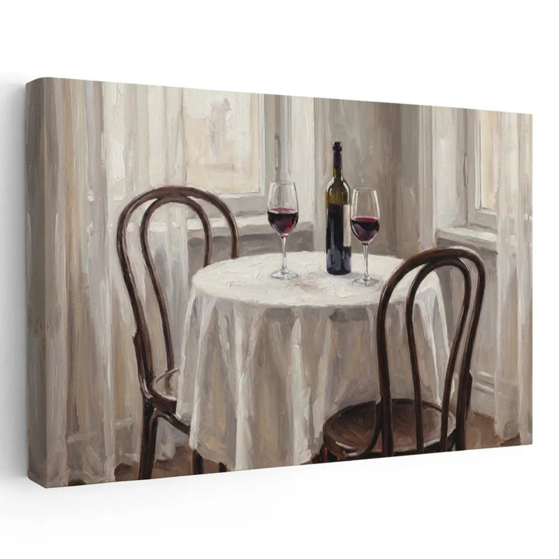 Vintage-style canvas wall art showing a cozy table for two with red wine and soft window light in a serene dining setting